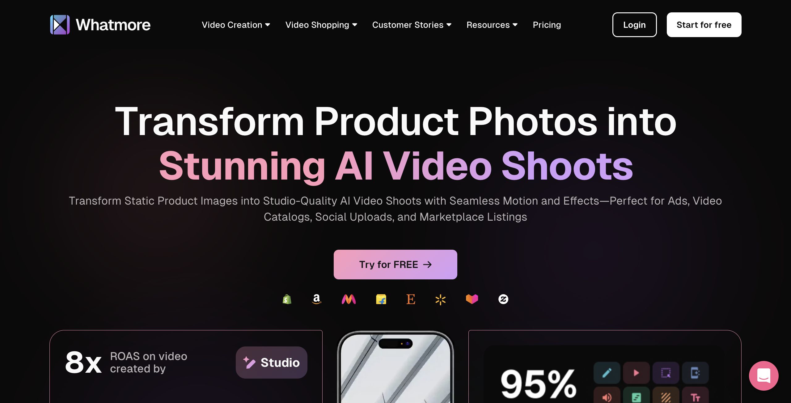Whatmore Studio is an AI-powered video creation tool designed specifically for e-commerce brands and marketers looking to enhance their video marketing efforts. The platform automates the process of transforming static product images and URLs into engaging, studio-quality videos—making it a highly relevant solution in today’s competitive digital landscape, where fast, cost-effective, and professional video content is essential for boosting online engagement and driving conversions.