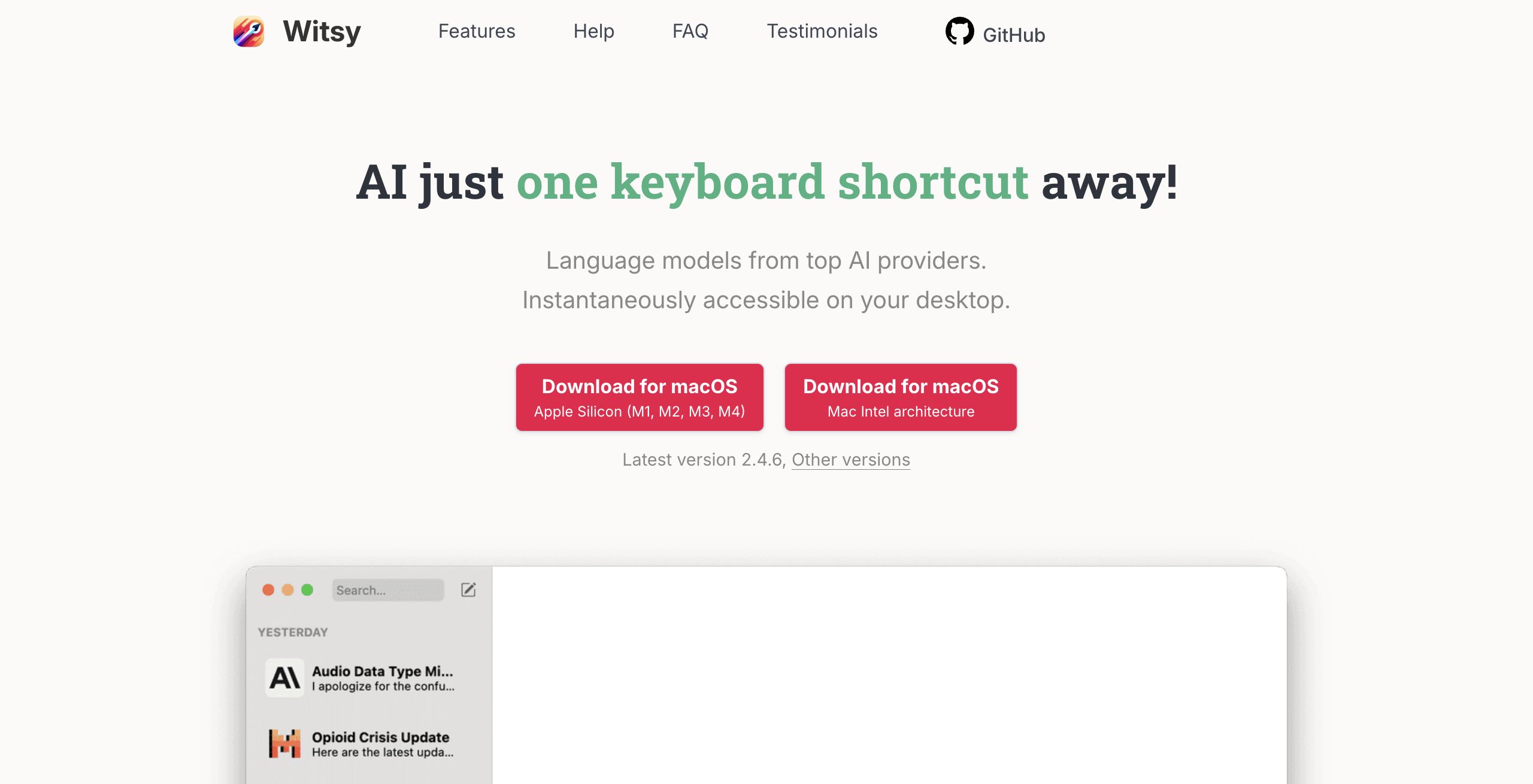 - Customizable Shortcuts: Quickly trigger any of Witsyβs features through keyboard shortcuts that can be tailored to your workflow.