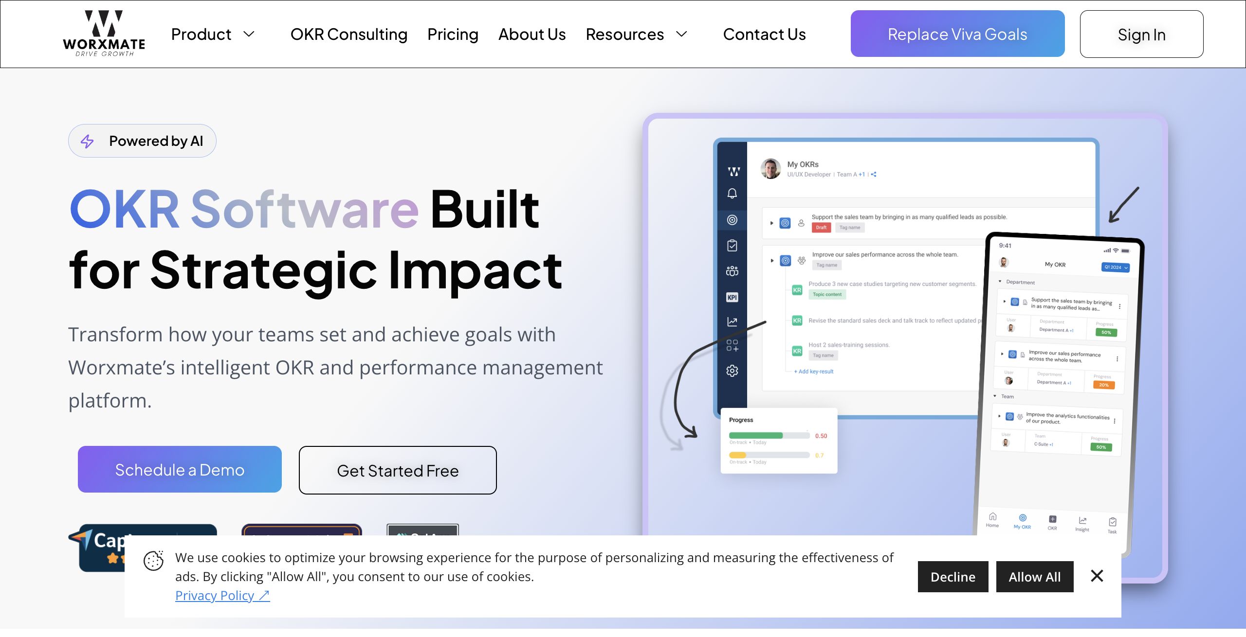Worxmate.ai is an AI-powered OKR and performance management tool designed to help organizations align goals, track progress, and drive overall productivity. Built to serve both businesses and professionals at all levels, this platform combines traditional performance management with advanced artificial intelligence to facilitate continuous improvement and strategic execution. With its growing relevance in today’s data-driven business world, Worxmate.ai is being reviewed as a promising solution for modern performance challenges.