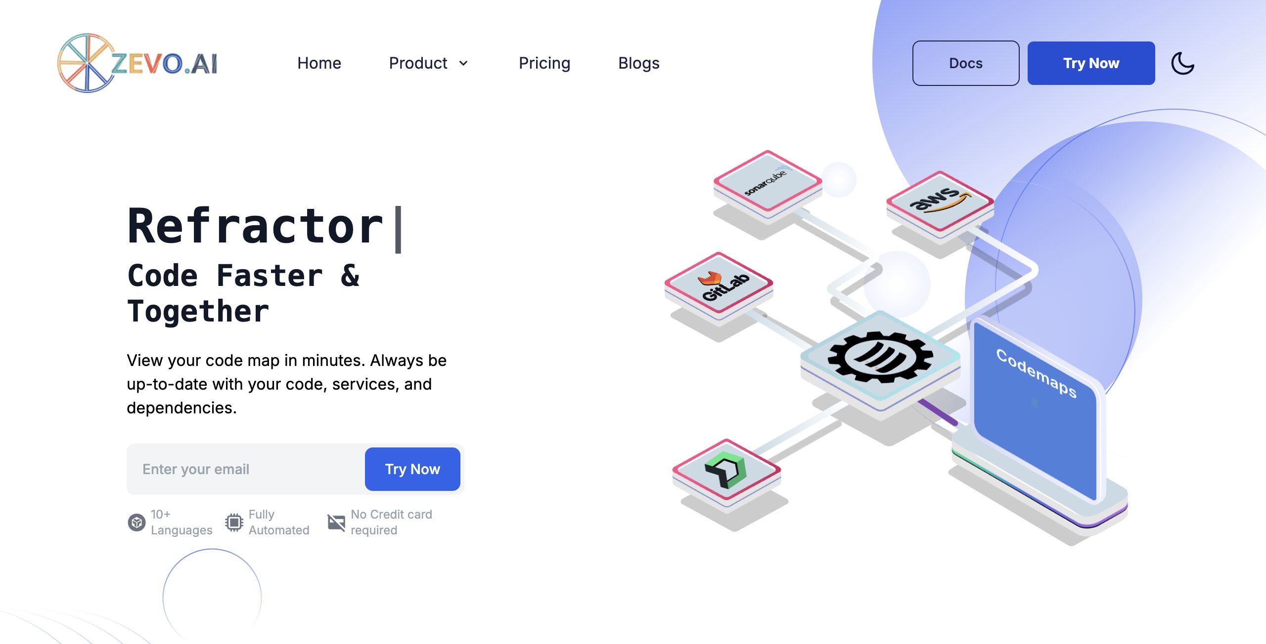 Zevo.ai is an automated tool that transforms code into dynamic visual maps, streamlining code comprehension and collaboration. It supports over ten languages and enhances processes like refactoring and onboarding without the need for a credit card trial.
