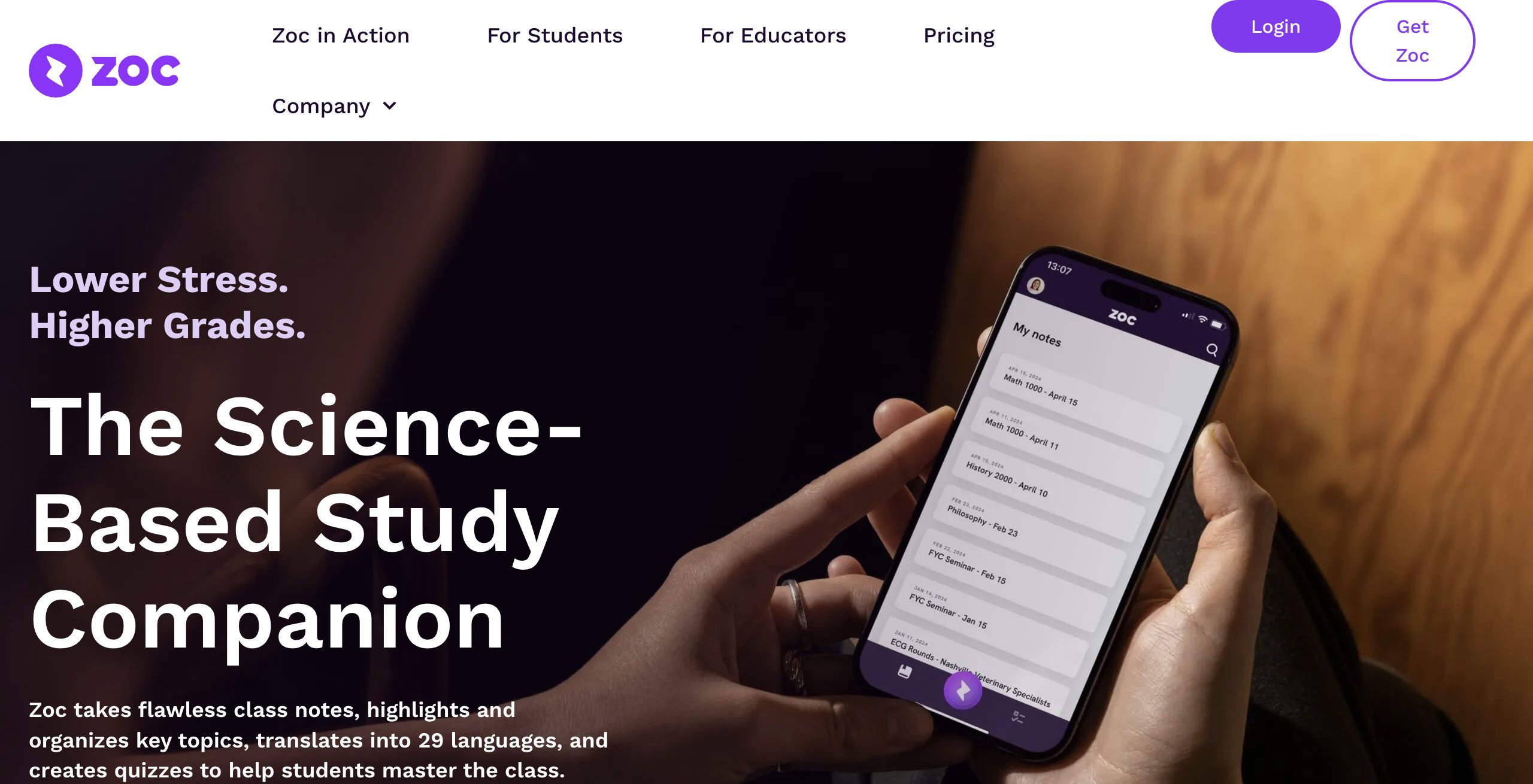 Zoc is an AI-powered study companion designed to assist students and educators in mastering their classes efficiently. By creating study notes, quizzes, and translations, Zoc transforms traditional learning by capturing accurate lecture transcripts and synthesizing key topics into easy-to-digest formats. In today’s educational environment—where rapid information access and multilingual support are crucial—Zoc offers a timely solution to enhance both academic performance and classroom engagement.
