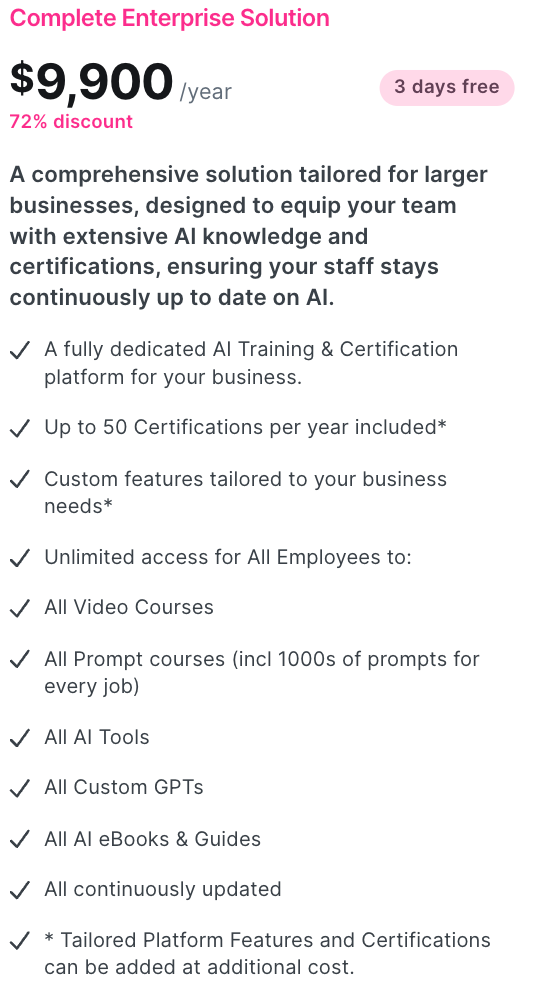 Discover the ultimate AI mastery for your enterprise with the Complete Enterprise Solution. For $2,900 a month, with an enticing 3-day free trial, this package is designed to empower larger businesses by equipping your team with extensive AI knowledge and certifications.